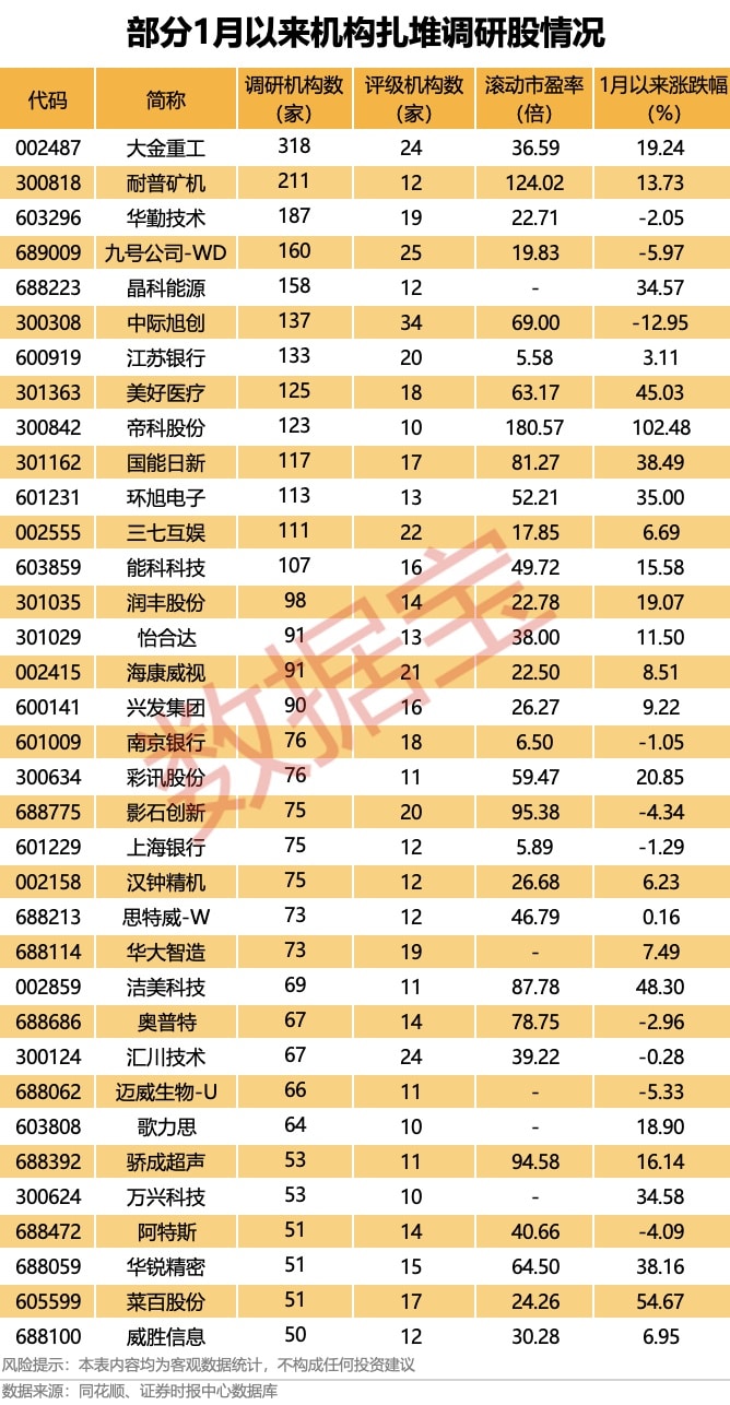 据证券时报·数据宝统计,1 月以来,调研机构数在 50 家及以上且评级机构数在 10 家及以上的公司,合计有 35 家。