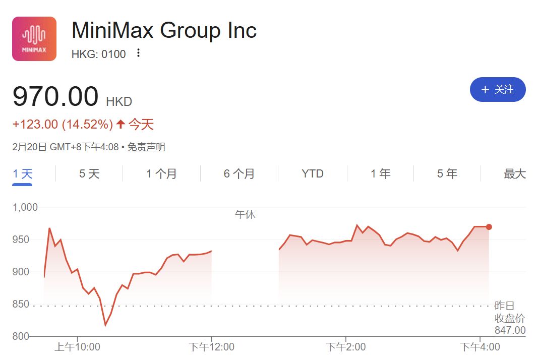 当天,智谱收报 725 港元/股,涨幅高达 42.72%,市值突破 3232 亿港元,单日市值增长超过 967 亿港元。MiniMax 同样表现不俗,收盘上涨 14.52%,报 970 港元/股,市值达 3042 亿港元,2 月累涨超 105%。