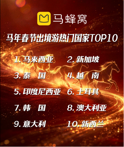 国内市场火爆的同时,出境游迎来格局大重构,马蜂窝大数据显示,2026 年春节出境游服务预订量同比增长近 30%,但目的地榜单发生显著变化,马来西亚跃升为出境游热门目的地榜首,新加坡、泰国、越南、印度尼西亚、土耳其、韩国、澳大利亚、意大利、新西兰包揽前十。其中土耳其凭借免签政策红利,热度暴涨 235%;米兰冬奥会与春节假期重合,带动意大利旅游热度飙升,热度增长 310%,米兰、罗马成为出境游热门城市,「观赛+旅行」 成为全新出行潮流。