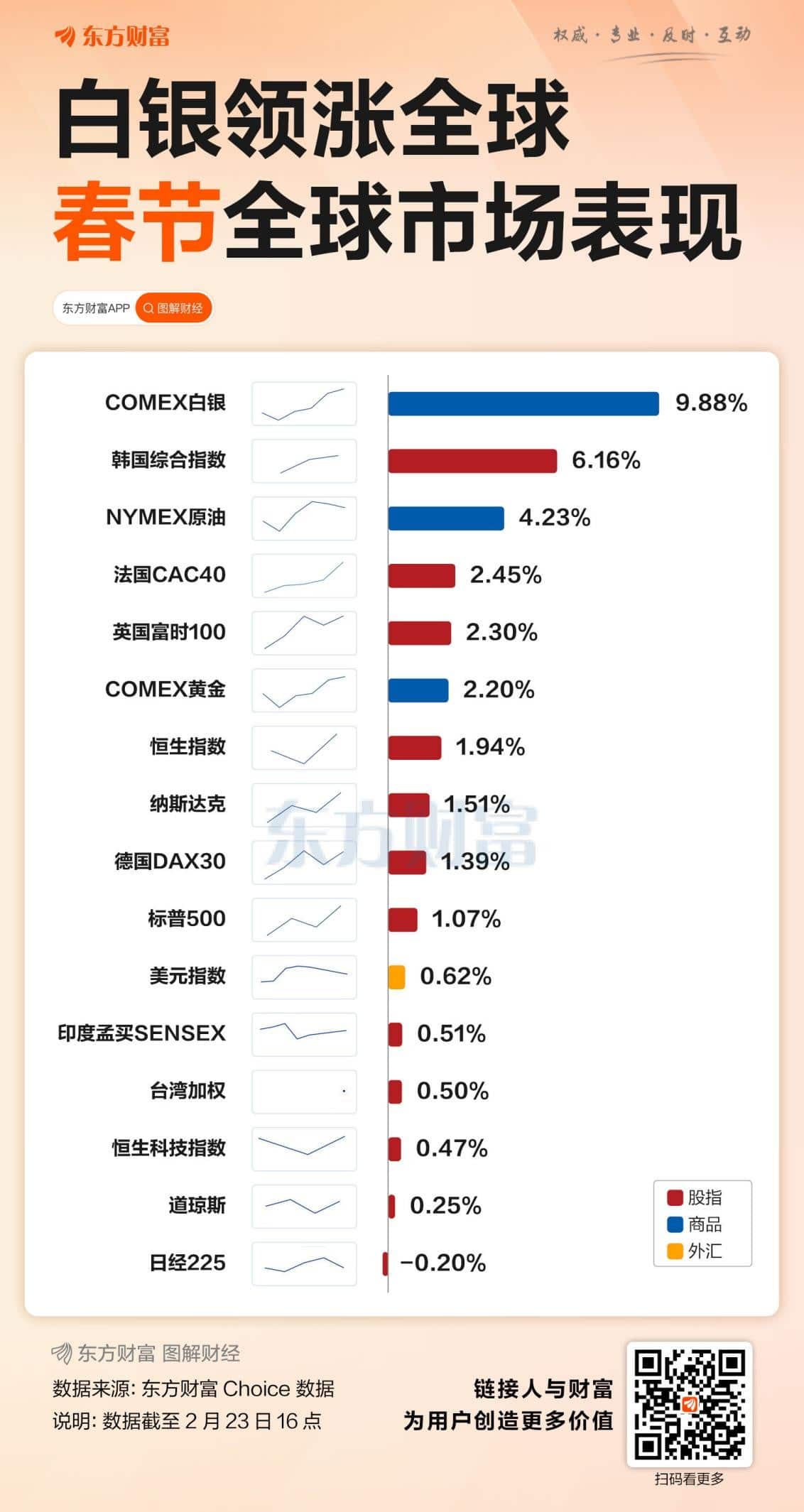 春节假期已至尾声,从假期全球资产表现来看,商品市场处于领涨之势,截至 2 月 23 日港股收盘 (以下同),COMEX 白银上涨 9.88%,处于领跑地位。此外,NYMEX 原油上涨 4.23%,COMEX 黄金上涨 2.2%。