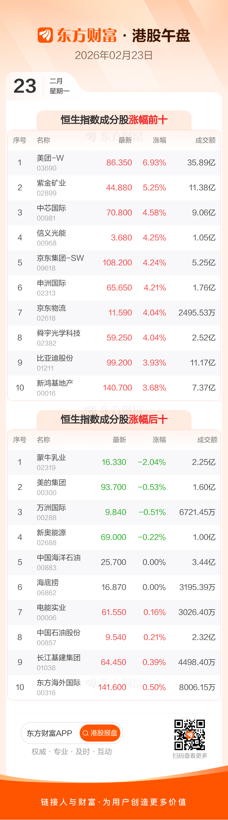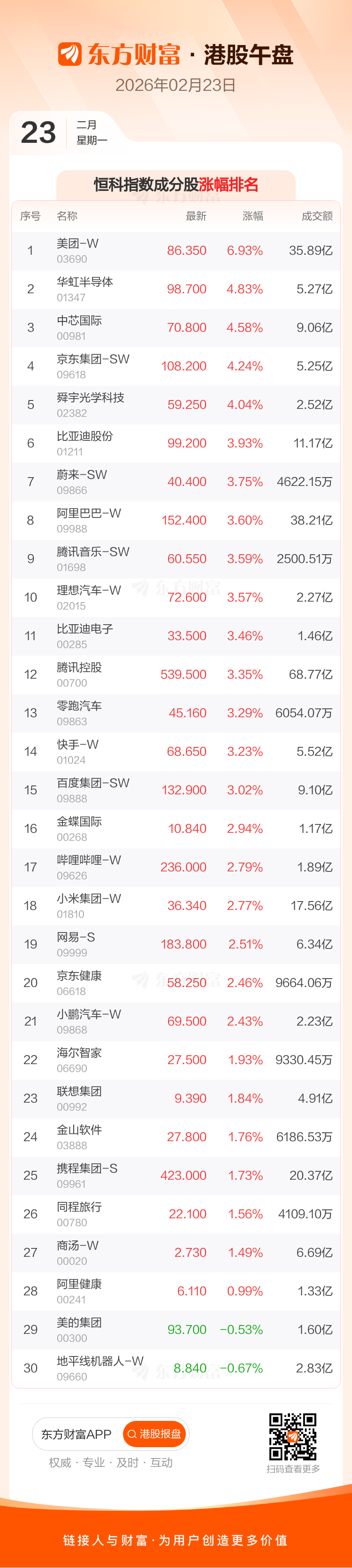港股 2 月 23 日午盘走高,恒生指数收报 27019.21 点,涨 605.86 点,涨幅 2.29%;恒生科技指数收报 5384.52 点,涨 173.02 点,涨幅 3.32%。恒生指数成分股中美团-W、紫金矿业、中芯国际涨幅居前,蒙牛乳业、美的集团、万洲国际跌幅靠前。恒生科技指数成分股中美团-W、华虹半导体、中芯国际涨幅居前,地平线机器人-W、美的集团、阿里健康跌幅靠前。