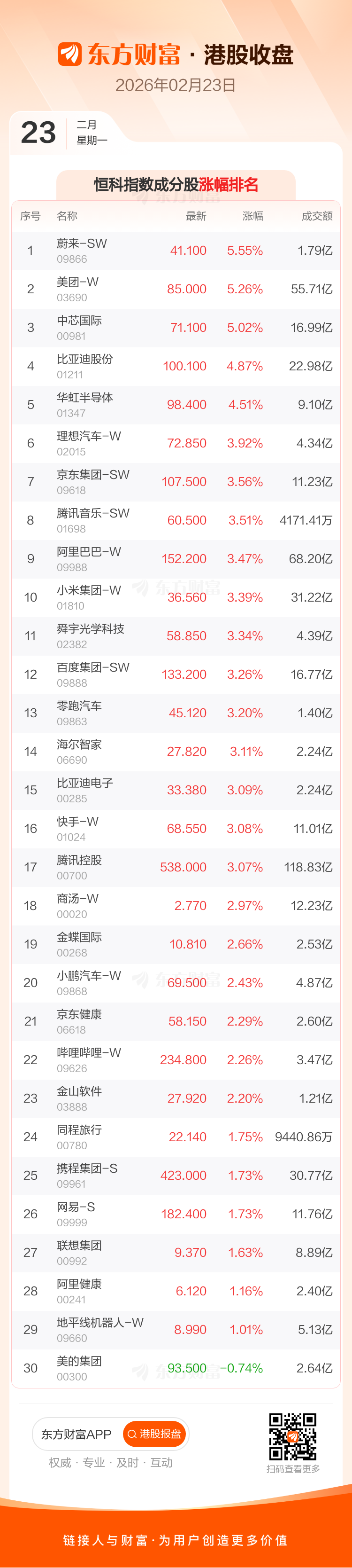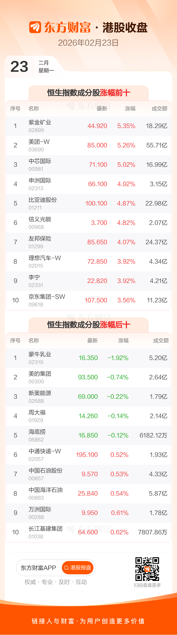 港股 2 月 23 日收盘走高,恒生指数收报 27081.91 点,涨 668.56 点,涨幅 2.53%;恒生科技指数收报 5385.35 点,涨 173.85 点,涨幅 3.34%。恒生指数成分股中紫金矿业、美团-W、中芯国际涨幅居前,蒙牛乳业、美的集团、新奥能源跌幅靠前。恒生科技指数成分股中蔚来-SW、美团-W、中芯国际涨幅居前,美的集团、地平线机器人-W、阿里健康跌幅靠前。