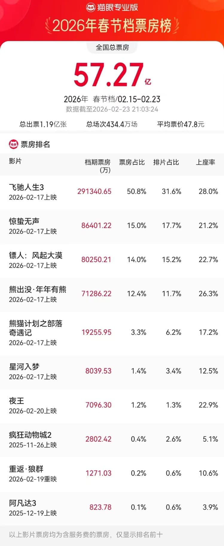 据猫眼专业版数据,截至 2 月 23 日 21 时,2026 年春节档档期总票房超 57 亿元,《飞驰人生 3》《惊蛰无声》《镖人:风起大漠》 分列前三位,票房依次为 29.13 亿元、8.64 亿元、8.02 亿元。上述三部影片的最新预测总票房分别为 42.66 亿元、12.33 亿元、13.02 亿元。