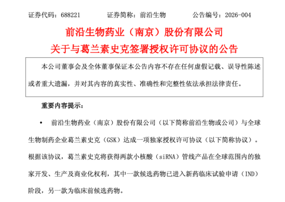 2 月 23 日晚间,前沿生物 (688221) 公告,公司已于 2 月 16 日与跨国药巨头葛兰素史克(GSK) 签署独家授权协议,将旗下两款小核酸 (siRNA) 在研产品的全球权益授予 GSK。