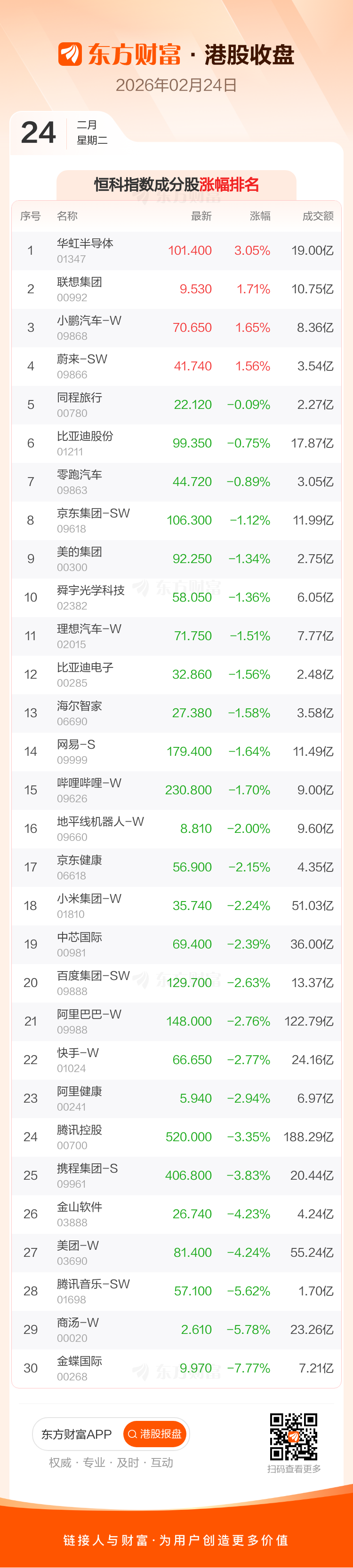 港股 2 月 24 日收盘走低,恒生指数收报 26590.32 点,跌 491.59 点,跌幅 1.82%;恒生科技指数收报 5270.7 点,跌 114.65 点,跌幅 2.13%。恒生指数成分股中万洲国际、恒基地产、华润啤酒涨幅居前,中国生物制药、翰森制药、中国人寿跌幅靠前。恒生科技指数成分股中华虹半导体、联想集团、小鹏汽车-W 涨幅居前,金蝶国际、商汤-W、腾讯音乐-SW 跌幅靠前。