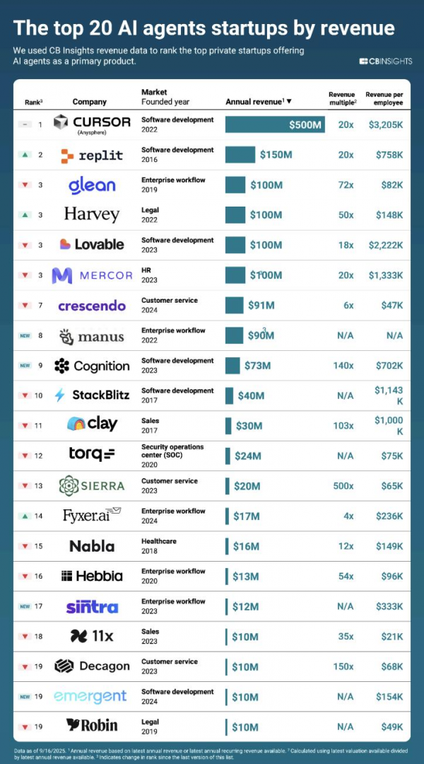 同时,AI 编程工具的商业化进程也在加速。CB Insights 的数据显示,编程 AI 智能体在商业化中遥遥领先,Cursor 年经常性收入达 5 亿美元,Replit 达 1.5 亿美元。