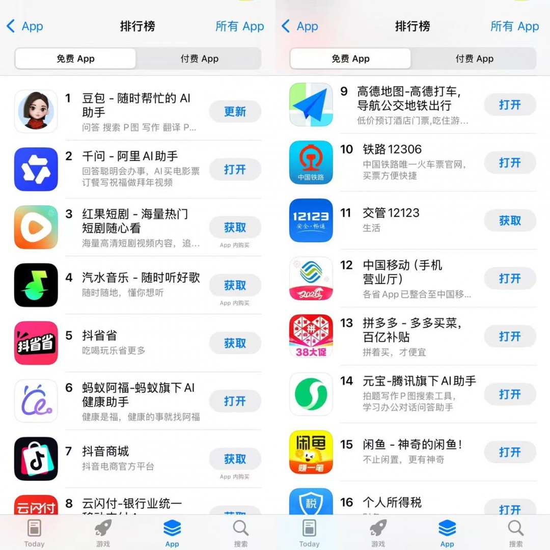 这两天,不少用户反映,「红包大战结束后,下载的应用已经卸载的差不多了」。也有用户表示,「还在用,给小孩检查作业挺好的」。截至发稿,苹果应用商店免费 APP 排行榜 TOP 10 中,豆包位列第一,千问第二,蚂蚁阿福第六,元宝已经跌至第 14 名。