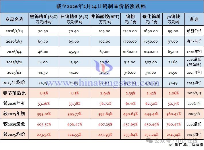 该机构数据显示,2 月 24 日,黑钨精矿 (规格≥65%) 价格为 70.5 万元/吨,较年初上涨 53.26%;仲钨酸铵 (APT) 价格为 105 万元/吨,较年初上涨 56.72%;钨粉价格为 1740 元/千克,较年初上涨 61.11%。