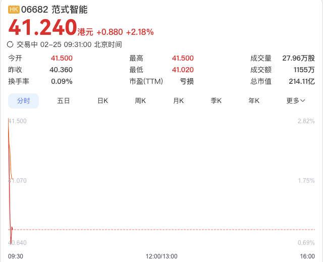 今日开盘,范式智能股价涨超 2.8%,截至 9:35 分涨 2.18%,报 41.24 港元。