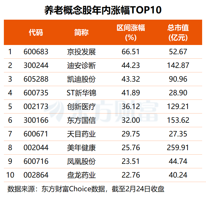 2026 年以来,共 96 只养老概念股录得股价上涨,占比超七成。其中,京投发展以 66.51% 的涨幅居首,迪安诊断、凯迪股份、ST 新华锦均涨逾四成,创新医疗、东方国信、悦心健康、可孚医疗等 9 股区间涨幅均在 20% 以上。