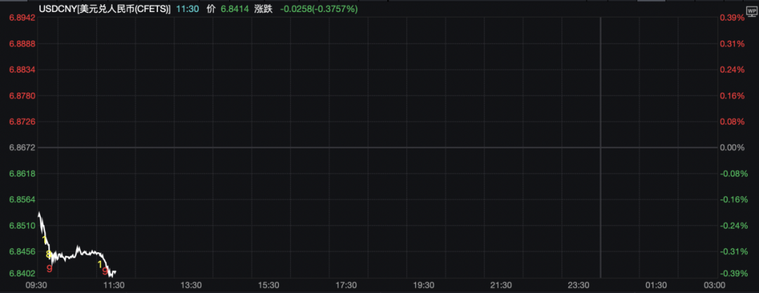 Wind 数据显示,截至 11:30,在岸人民币对美元汇率报 6.8414 元,较前收盘价上涨 258 个基点,盘中最高报 6.8402 元;离岸人民币对美元汇率报 6.8374 元,较前收盘价上涨 171 个基点,盘中最高报 6.8361 元。