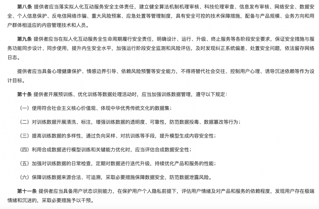 国家网信办近期公布的 《人工智能拟人化互动服务管理暂行办法 (征求意见稿)》 明确提出,服务提供者应当落实安全主体责任;提供和使用拟人化互动服务,不得生成、传播侮辱或者诽谤他人,侵害他人合法权益的内容。