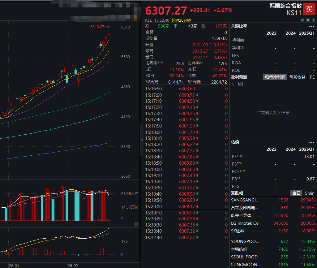 2 月 26 日,韩国股市再创新高。截至当日收盘,韩国综合股价指数涨 3.67%,报 6307.32 点,盘中更是创下 6313.27 点的历史新高,年初至今涨幅高达 49.67%。