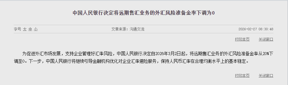 为促进外汇市场发展,支持企业管理好汇率风险,中国人民银行决定自 2026 年 3 月 2 日起,将远期售汇业务的外汇风险准备金率从 20% 下调至 0。下一步,中国人民银行将继续引导金融机构优化对企业汇率避险服务,保持人民币汇率在合理均衡水平上的基本稳定。