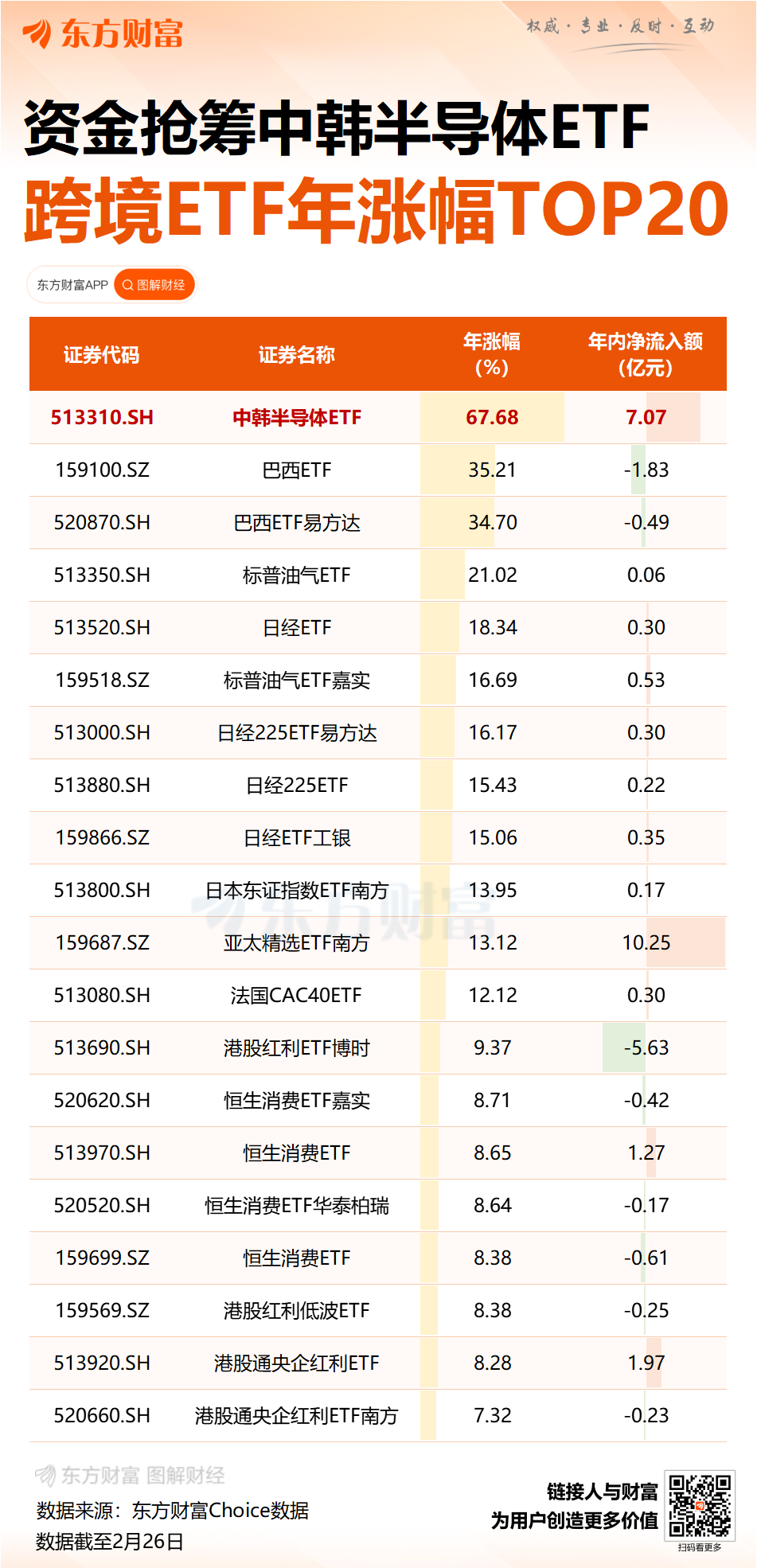 有关注韩国市场的基金经理透露,韩国市场由三星电子等半导体权重股领涨,凸显了股市表现与全球科技产业周期的紧密绑定,在科技芯片股领涨、宏观经济预期改善以及市场情绪高涨的共同作用下,追踪韩国股市的 ETF 也随之水涨船高。