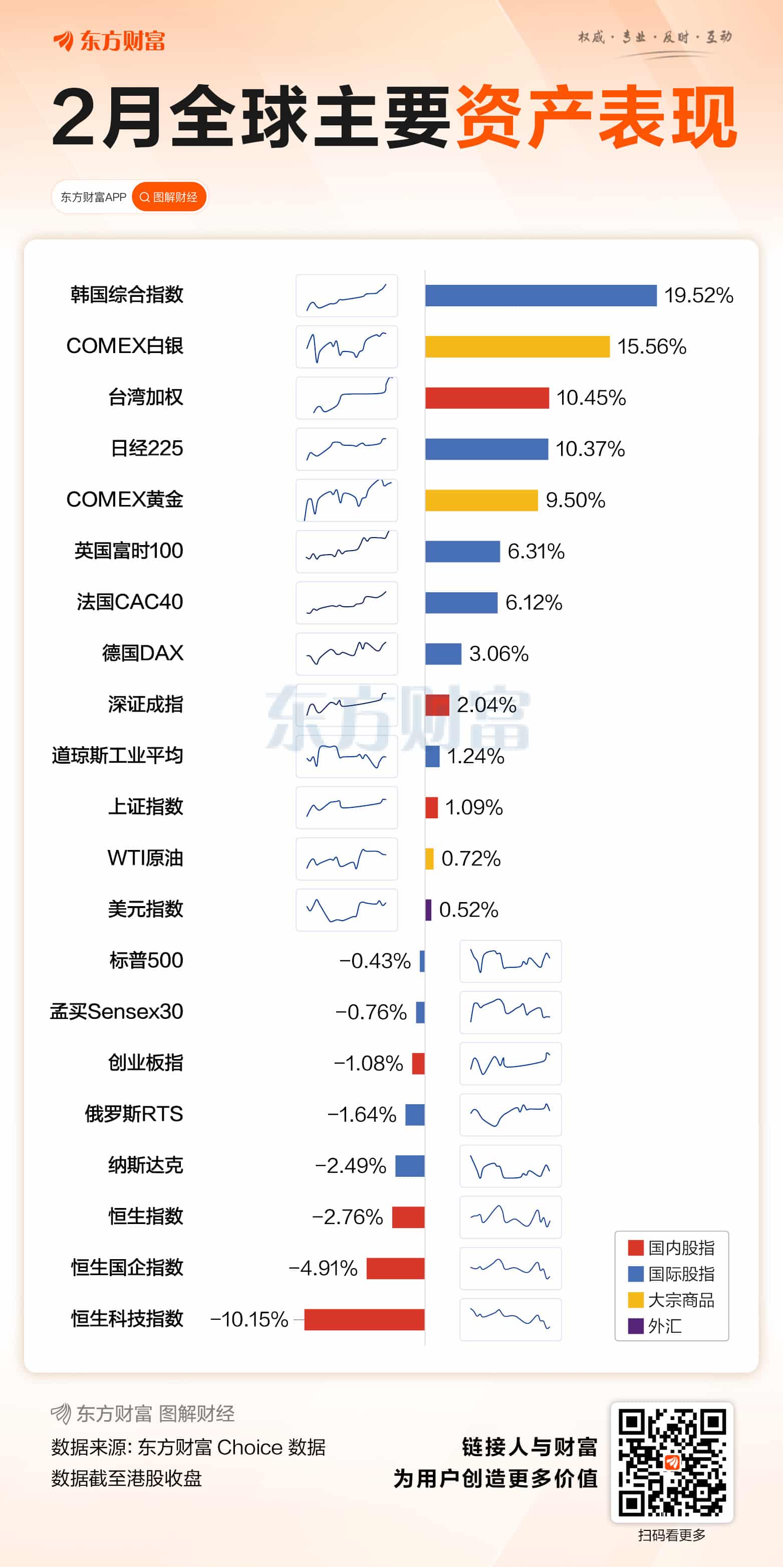 横向来看,2 月全球主要股指表现分化。日韩股指当月大涨,韩国综合指数暴涨 19.52%,领涨全球主要资产;日经 225 指数涨超 10%。美股相对较弱,道琼斯指数当月涨超 1%,纳斯达克指数下跌 2.49%。港股三大指数集体调整,其中恒生科技指数当月跌超 10%,领跌全球主要资产。