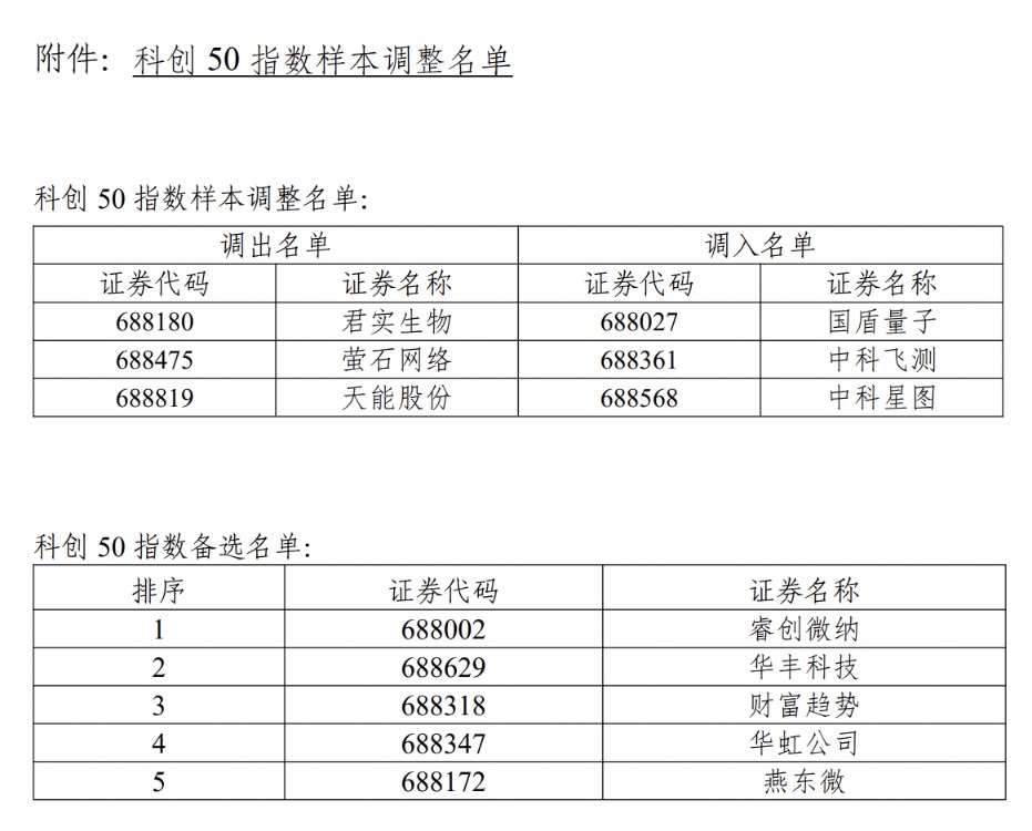 2 月 27 日,上海证券交易所与中证指数有限公司联合发布公告称,决定调整科创 50 等指数样本,于 2026 年 3 月 13 日收市后生效。