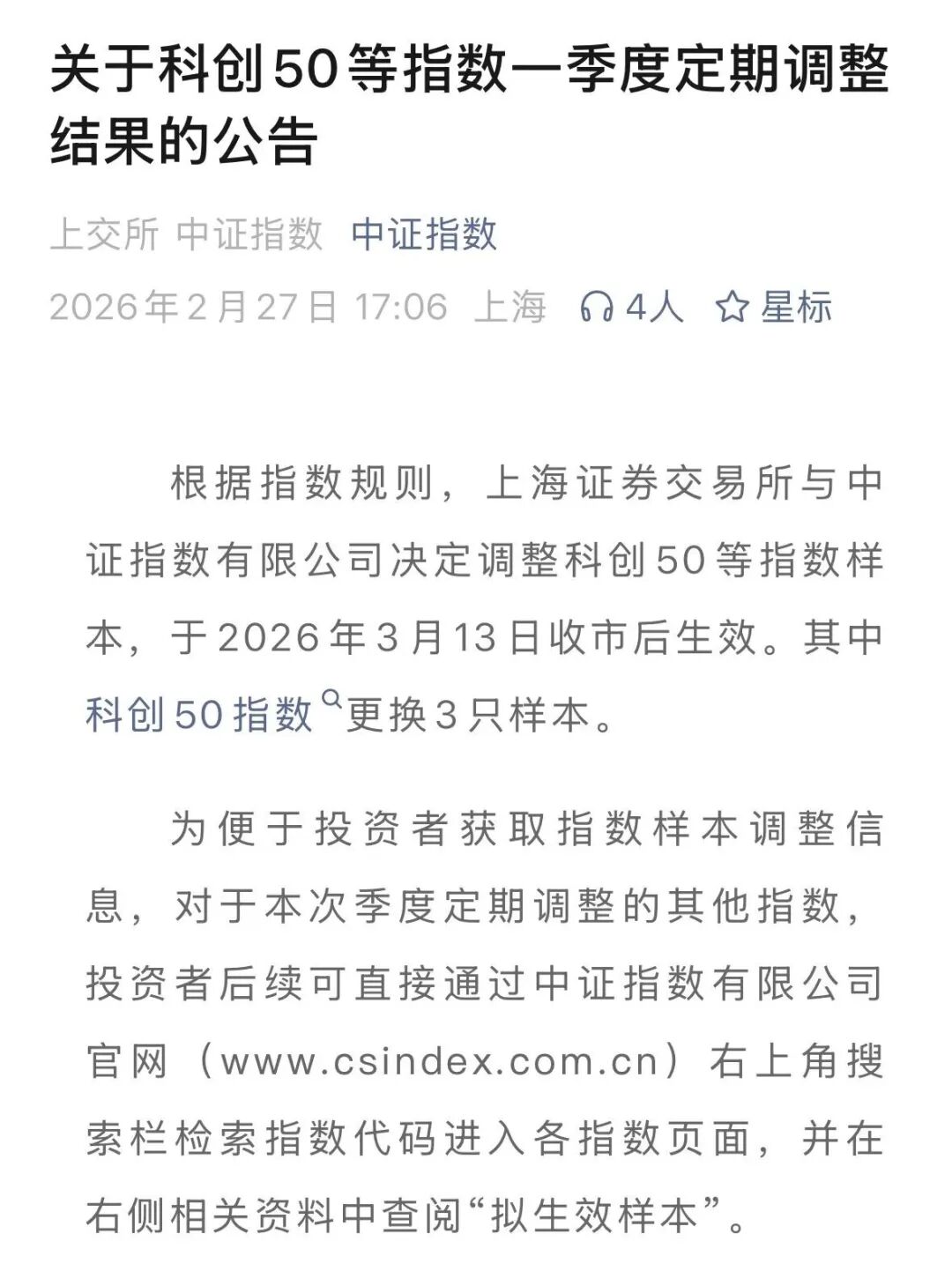 2 月 27 日晚,上交所和中证指数有限公司联合发布公告称,根据指数规则,上交所与中证指数有限公司决定调整科创 50 等指数样本,于 3 月 13 日收市后生效。
