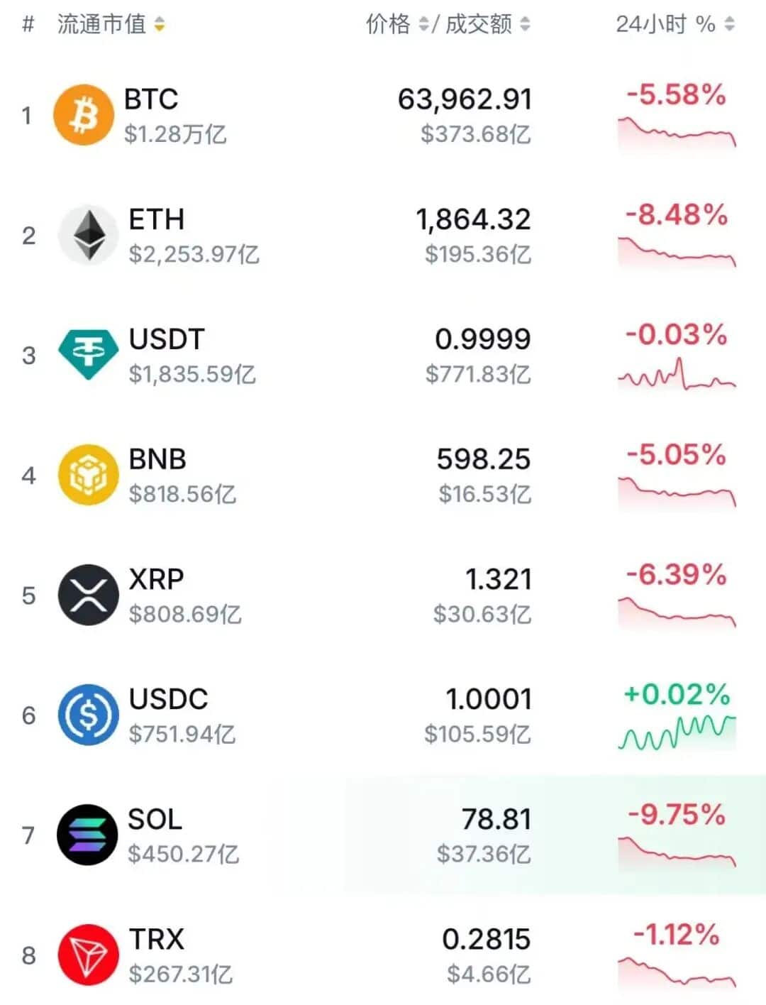 市场方面,比特币快速下挫,跌破 64000 美元,日内跌 3.5%,近 24 小时内跌超 5.5%。以太坊近 24 小时内大跌超 8.4%,报 1864 美元。solana 币跌近 10%,BNB 跌超 5%。