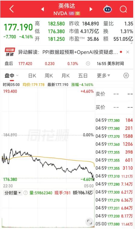 英伟达市值一夜蒸发 1871 亿美元 (约合人民币 12832 亿元)。
