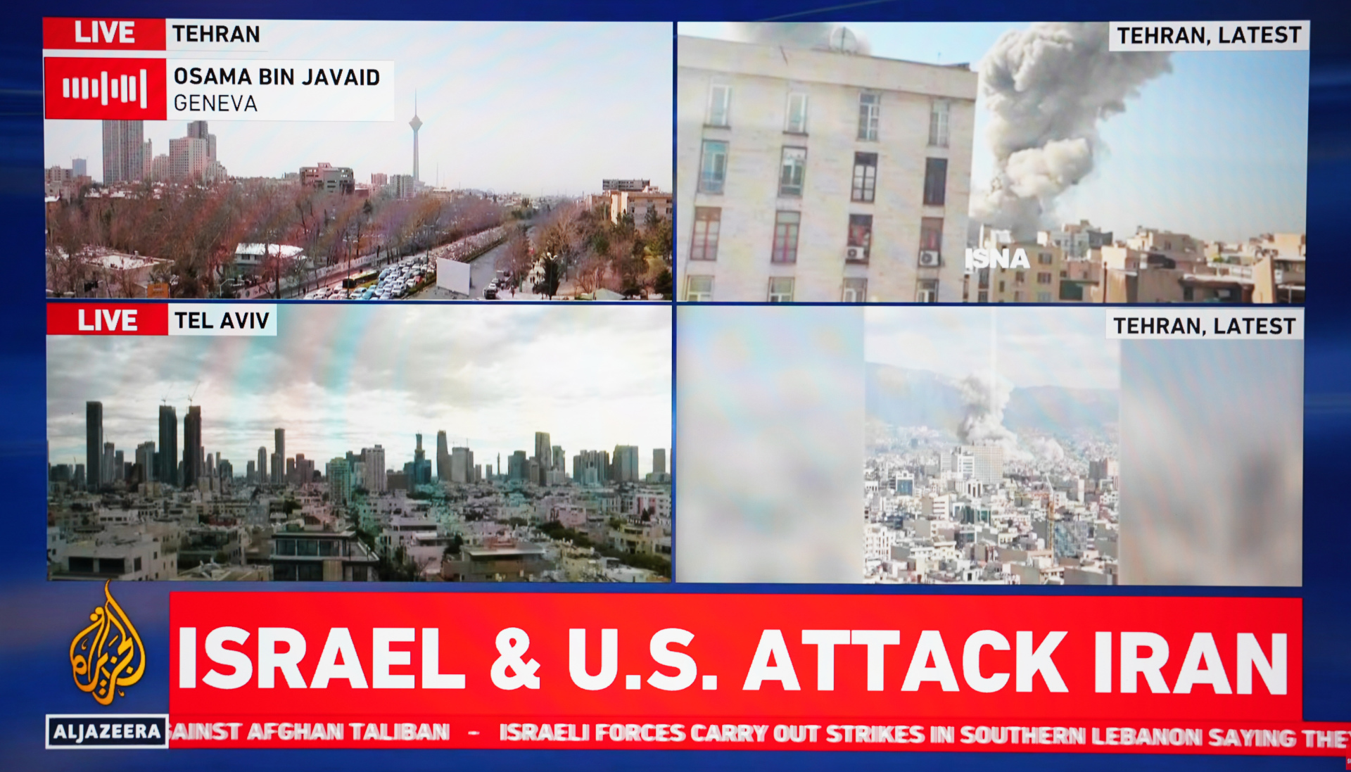这张 2 月 28 日拍摄的半岛电视台直播画面显示的是美国与以色列对伊朗发起联合军事行动。图片来源:新华社记者 张浩波 摄