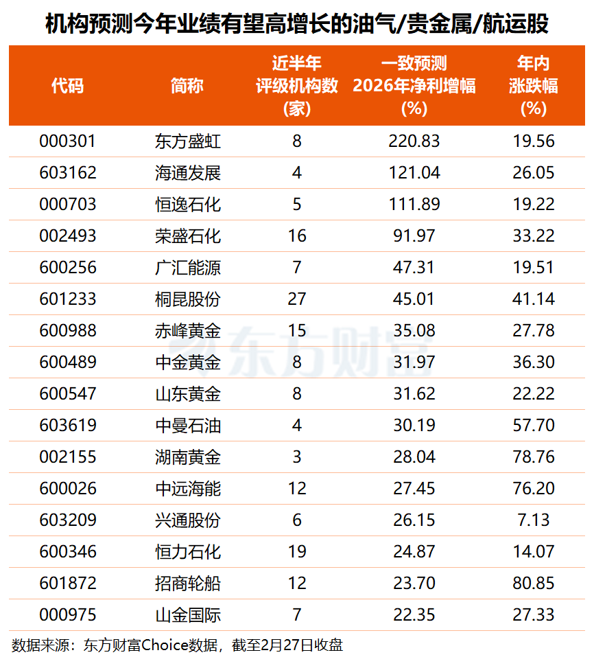 东方财富Choice 数据显示,根据 3 家及以上机构一致预测,共计 16 只油气、贵金属、航运股 2026 年净利有望实现 20% 以上增长。