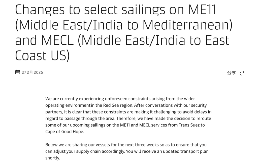 马士基方面,当地时间 2 月 27 日发布通知称,「我们目前正面临红海地区运营环境的突发限制。与我们的安全合作伙伴沟通后,我们了解到这些限制会导致难以避免的船期延误。因此,我们决定将 ME11 和 MECL 航线近期的部分航次从苏伊士航线改道至好望角。此次调整是因红海地区运营环境的突发限制而采取的临时措施。在所有其他 MECL 和 ME11 航次上,我们仍将优先选择苏伊士航线,因为这仍然是我们最快、最可持续且最高效的服务客户的方式。」