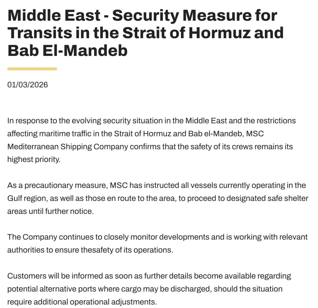 据记者梳理,全球运力第一的航运企业地中海航运公司 (MSC) 当地时间 3 月 1 日在官网发布公告称,鉴于中东地区安全局势不断变化,以及霍尔木兹海峡和曼德海峡海上交通受到限制,MSC 已指示所有目前在海峡地区运营的船舶以及正在前往该地区的船舶驶往指定的安全避风区域,直至另行通知。