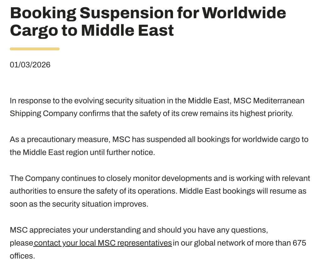 此外,3 月 1 日地中海航运公司还发布公告称,鉴于中东地区安全形势不断变化,MSC 已暂停所有全球范围内前往中东地区的货物预订,直至另行通知。公司将继续密切关注事态发展,并与相关部门合作,以确保运营安全。一旦安全形势好转,公司将立即恢复中东地区的货物预订。
