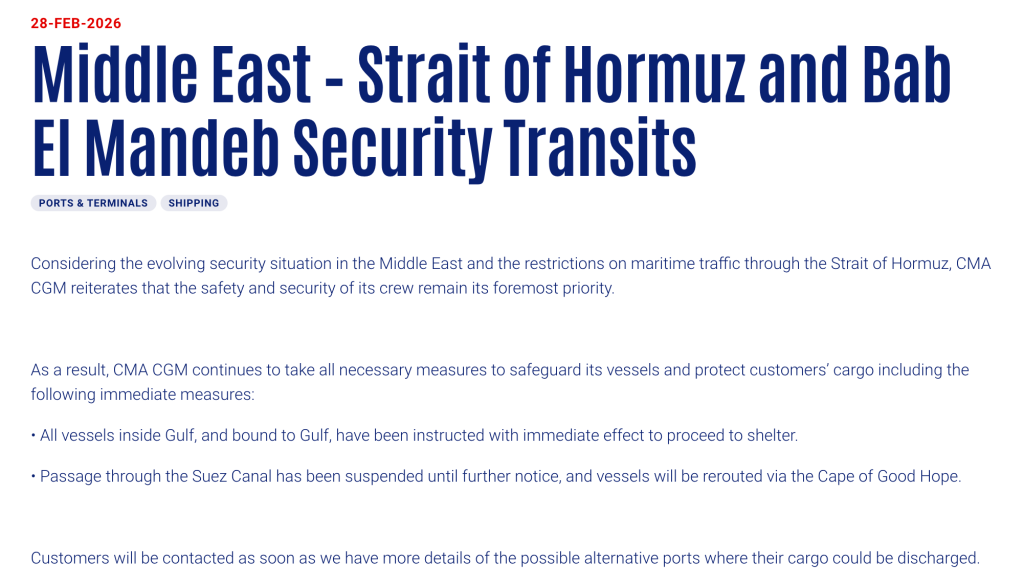 当地时间 2 月 28 日,法国达飞海运集团 (CMA CGM) 在官网发布公告称,鉴于中东地区不断变化的安全局势及霍尔木兹海峡海上交通管制,集团将继续采取一切必要措施保障船舶及客户货物安全。即刻起,所有位于海峡内及驶往海峡的船舶均已接到指令,前往安全区域避险。此外,暂停向苏伊士运河通行,直至另行通知;相关船舶将改道经好望角航行。一旦确定可供卸货的备选港口,集团将第一时间与客户联系。