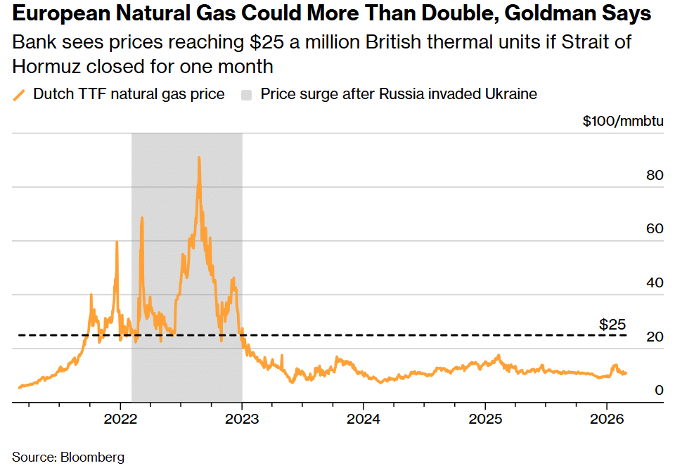 包括丹•斯特鲁文在内的 (Daan Struyven) 高盛分析师在 3 月 1 日的一份报告中表示,欧洲和亚洲的基准价格几乎没有计入与伊朗相关的风险溢价。全球约五分之一的液化天然气 (主要来自卡塔尔) 经过这条咽喉要道,若中断一个月,欧洲天然气价格和亚洲现货液化天然气可能飙升 130%,达到每百万英热单位 25 美元。