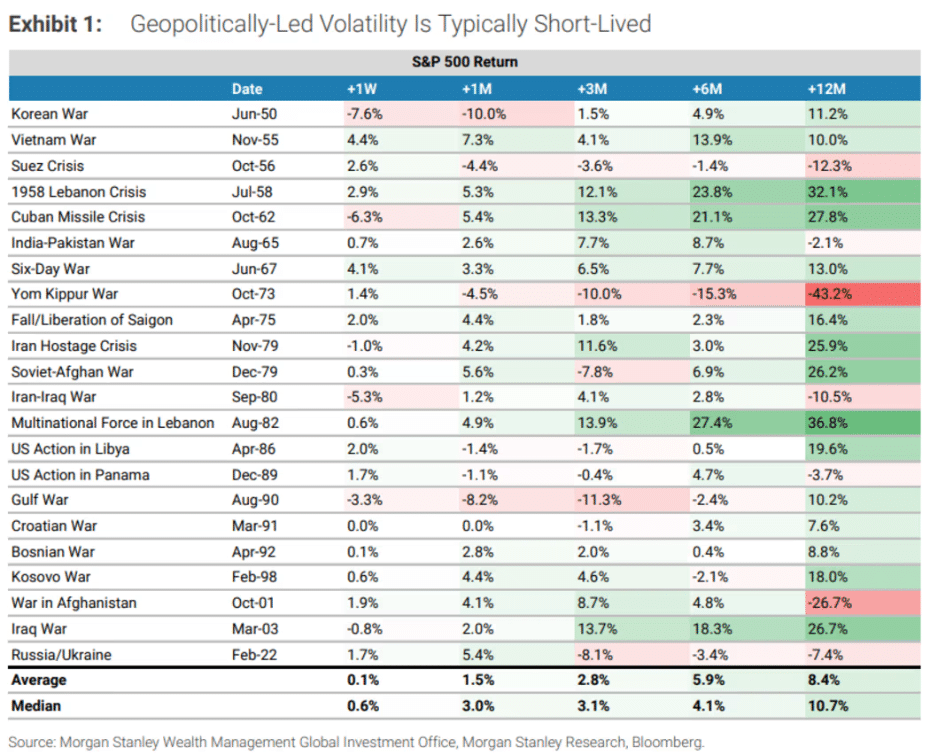 截至目前,对股市 12 个月走势打击最严重的是 1973 年赎罪日战争,当时石油供应危机直接引发了经济衰退。