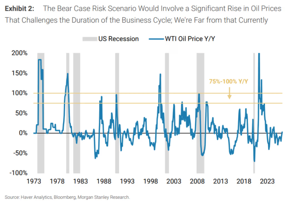 他表示,历史表明,油价飙升要产生如此严重的破坏,必须满足两个条件:同比涨幅达到 75%~100%,且发生在经济增长周期的后期。