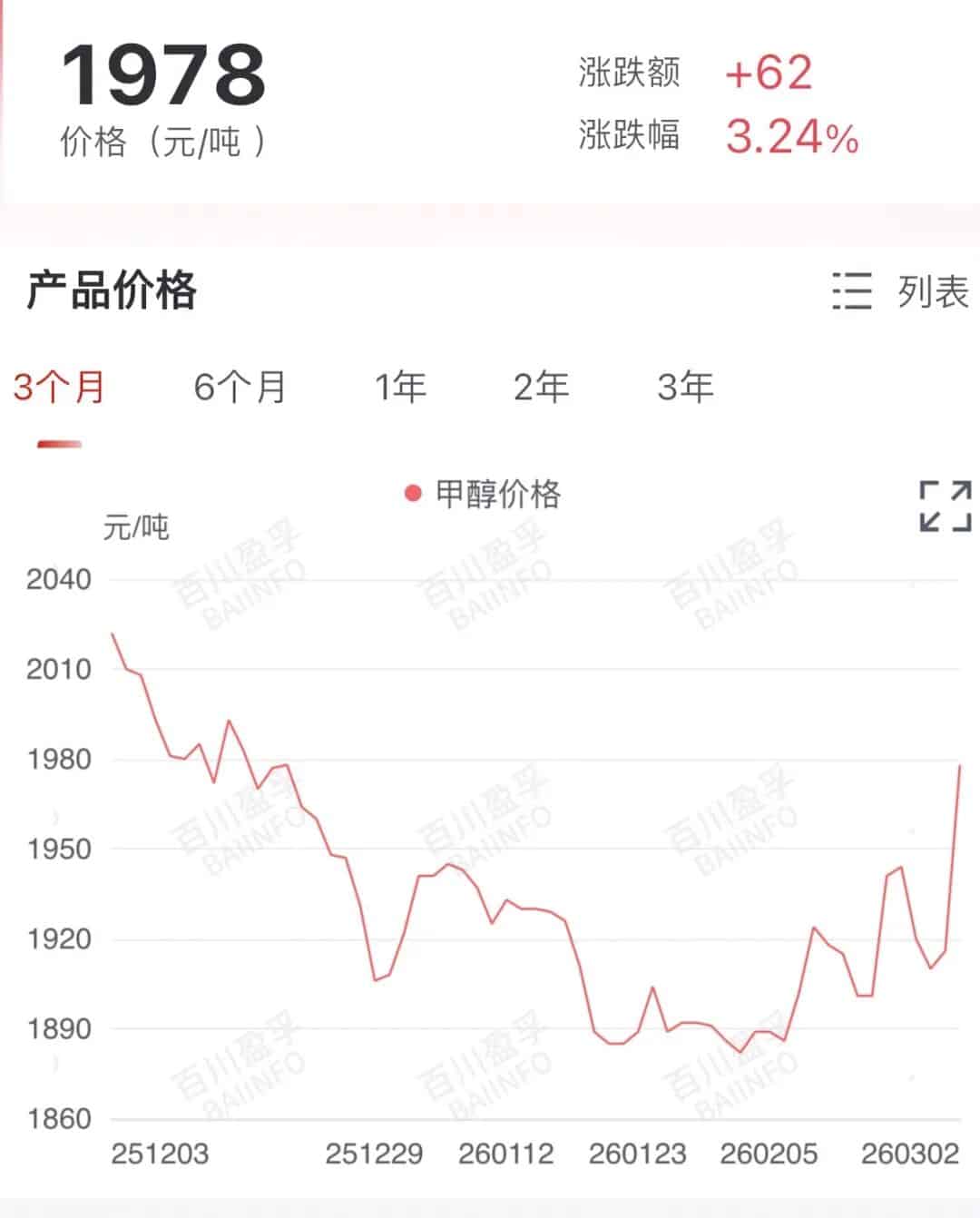 3 月 2 日,国内甲醇市场均价 1978 元/吨,较上个交易日每吨上涨 62 元,涨幅 3.24%。图片来源:百川盈孚