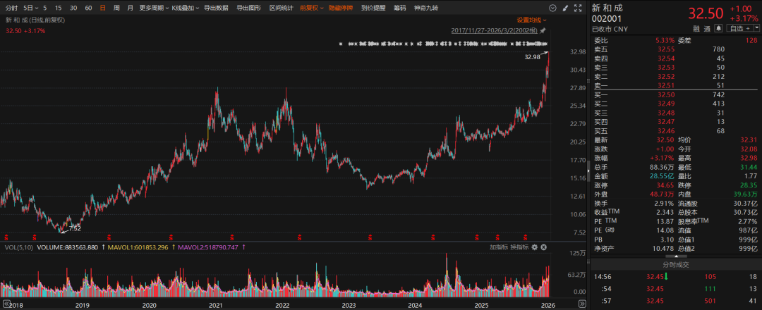 3 月 2 日,新和成股价上涨 3.17%,股价盘中最高触及 32.98 元,报收 32.5 元,创出历史新高,总市值高达 999 亿元。