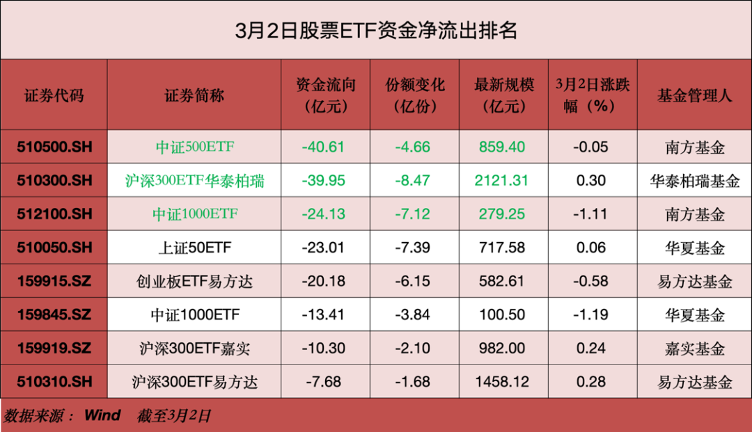 【导读】3 月资金面延续流出态势,3 月 2 日股票 ETF 净流出超 95 亿元
