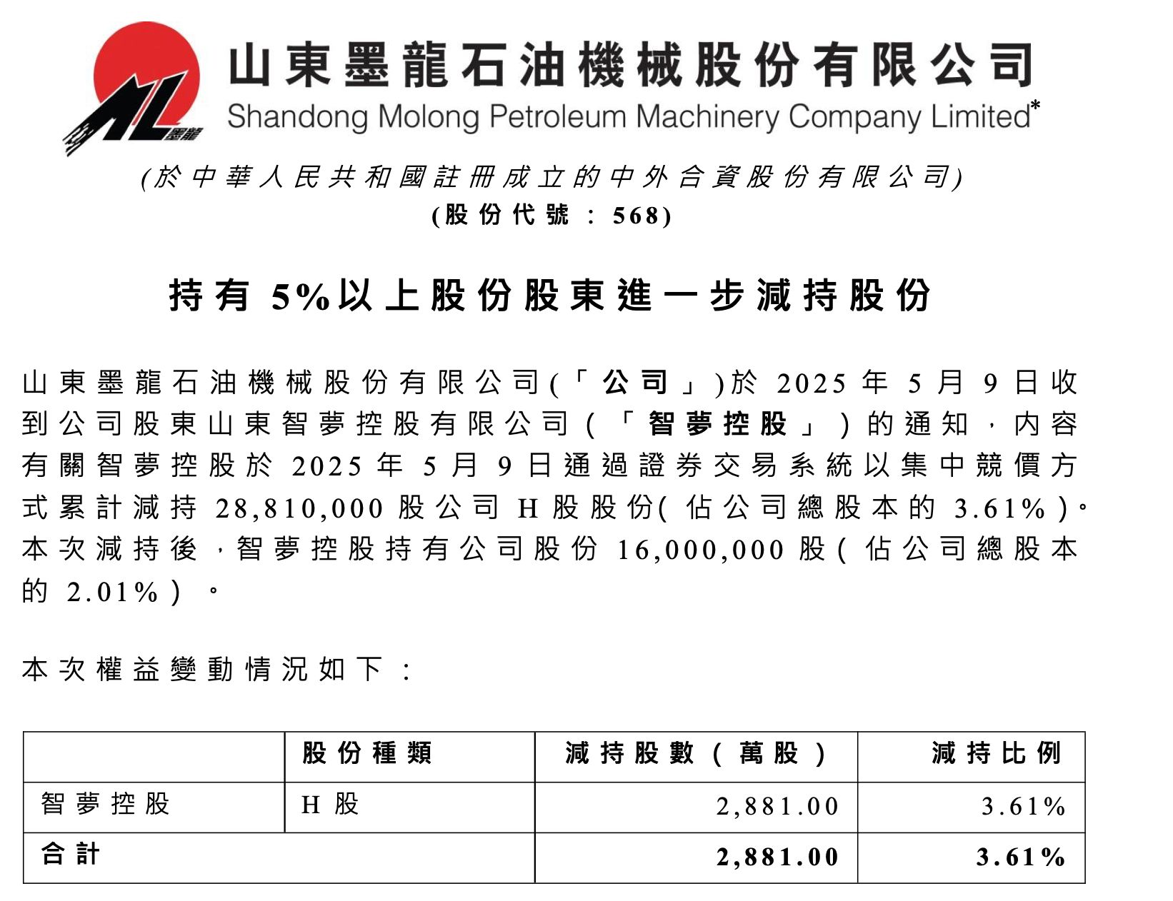 回溯历史,2025 年 5 月 6 日,山东墨龙 H 股曾因油价上涨推动股价当天大涨 188%。但随后的 5 月 8 日和 9 日,当时公司第三大股东山东智梦控股开启逢高 「高比例」 减持,导致股价几个交易日内大幅回落。减持之后,智梦控股退出公司前十大股东之列。