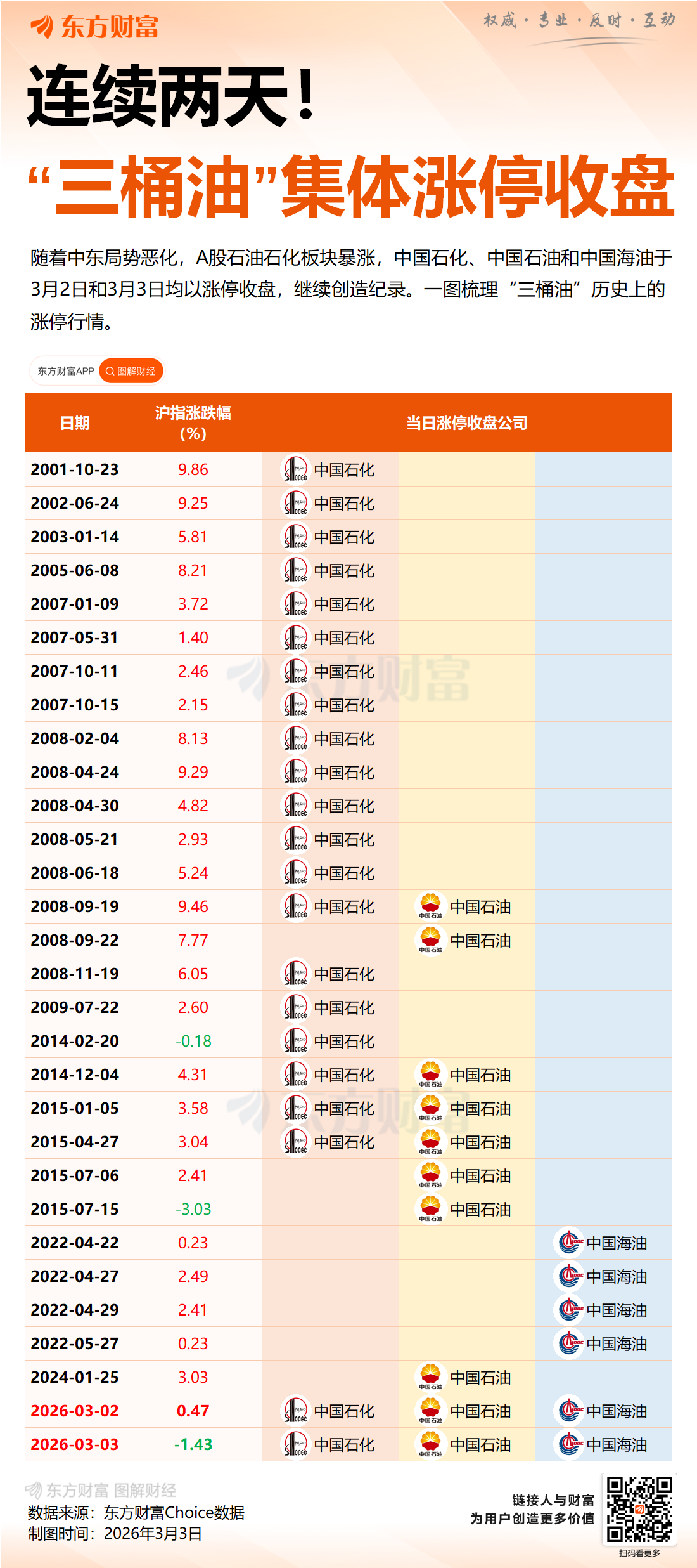 受中东地缘政治局势骤然升级影响,A 股油气板块迎来历史性行情。3 月 2 日至 3 月 3 日,中国石油(601857.SH)、中国石化(600028.SH)、中国海油(600938.SH) 三大石油巨头连续两个交易日集体涨停,创下 A 股市场历史纪录。