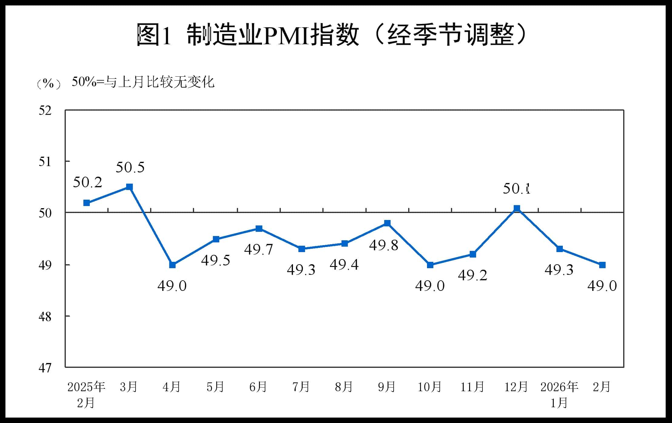 2 月份,制造业采购经理指数 (PMI) 为 49.0%,比上月下降 0.3 个百分点,制造业景气水平有所回落。