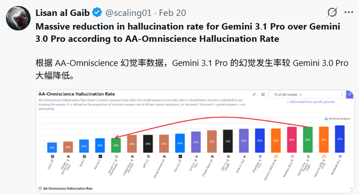 AA-Omniscience Index 跃升:该指标衡量模型的 「自知之明」 也就是对自身知识边界的认知 (抗幻觉)。Gemini 3.1 Pro 从上一代 13 分跃升至 30 分,位居主流模型第一——这意味着它拒绝回答不熟悉问题的准确率更高,在擅长领域给出错误信息的概率更低,减少胡说八道的概率。
