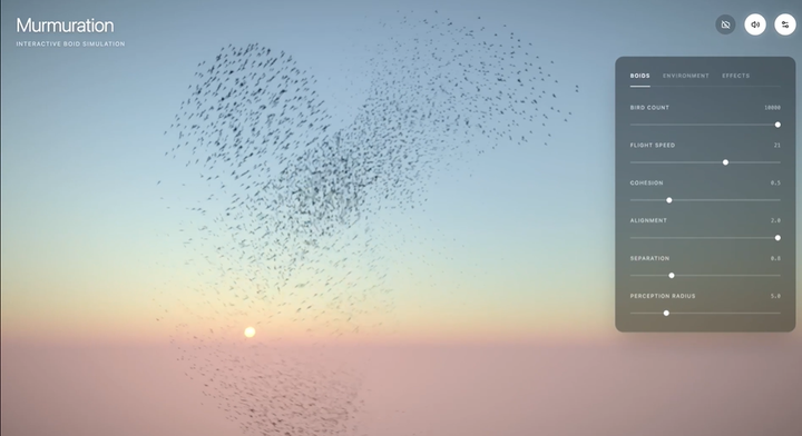 Gemini 3.1 Pro 能生成复杂的 3D 椋鸟群舞动画,打造沉浸式体验。它基于 3D 算法模拟椋鸟群飞,用户可通过手部追踪技术实时操控鸟群飞行方向与轨迹。鸟群运动时,系统还会同步生成动态配乐,将视觉与听觉融合,为交互设计与创意编程提供了高效的原型验证。