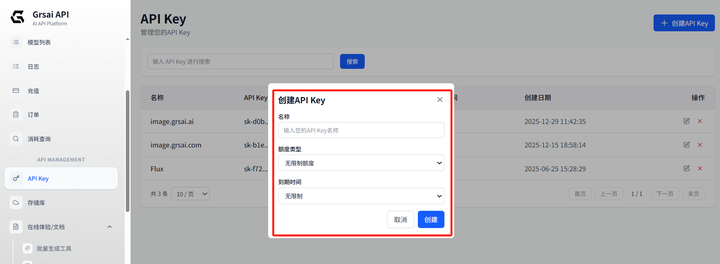 1. 获取 APIKey:Grsai 控制台设置 ApiKey( https://grsai.com/zh/dashboard/api-keys com 域名访问需要魔法,没有改成 ai),复制 ApiKey