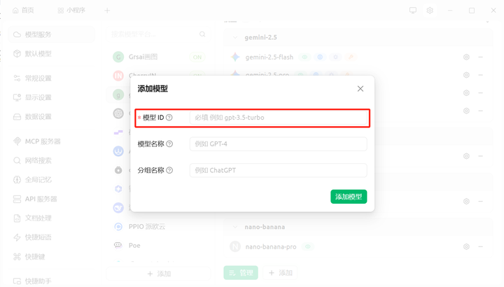 2. 添加模型服务:在设置菜单中,找到并点击 「模型服务」 点击添加,输入供应商名称 (自定义随意写),模型提供商 OpenAI 和 Gemini 都支持。