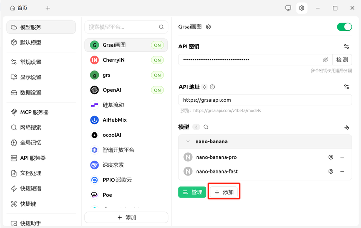 Cherry Studio 黏贴 ApiKey(保密不可外泄) 和 APi 地址 (base url):https://grsaiapi.com