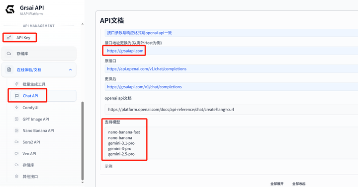 Grsai 的 Chat API 完全兼容 OpenAI 和 Gemini 格式,OpenAI 只需替换基础地址,Gemini 则需要替换基础地址和模型名称即可调用。