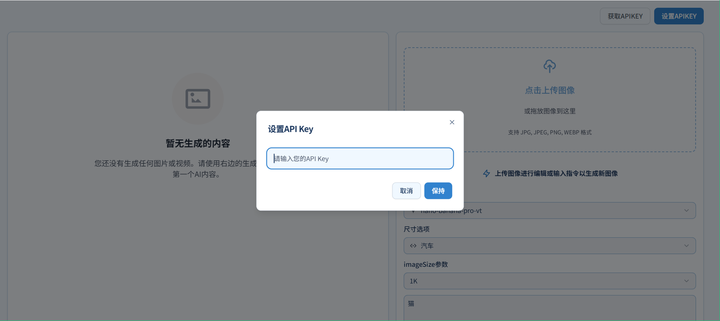 2. 配置 API:打开批量生图工具 (https://image.grsai.com/ com 域名访问需要魔法,没有改成 ai),右上角设置 APIKey,黏贴你的 API Key
