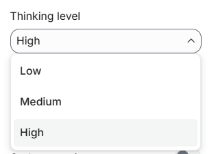 High (高):深度推理模式 (Deep Think Mini),思考 Token 预算最高,适合专业复杂任务。模型会激活类似 「Deep Think」 的强大推理引擎,进行极其深入的多步骤思考,以达到最佳效果。虽然成本比中低档位高,但相比上一代的 Deep Think 模式,同等深度下成本降低了约 30%——因为架构优化了,钱花得更值。