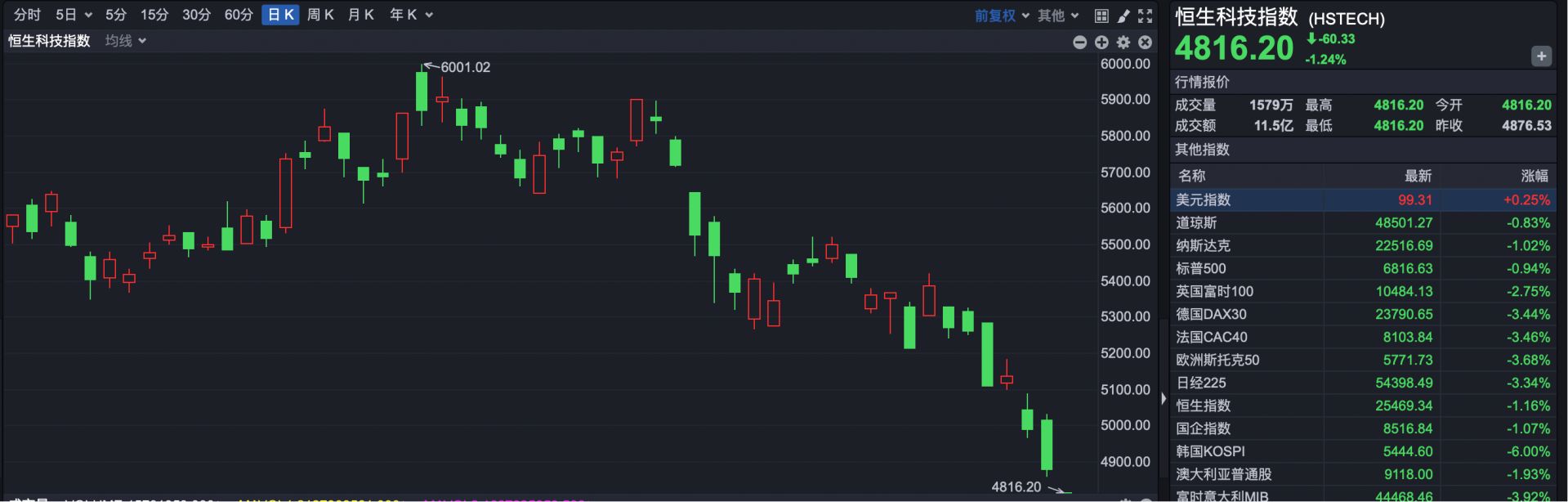 恒生科技指数开盘报 4816.20 点,下跌 60.33 点,跌幅 1.24%。