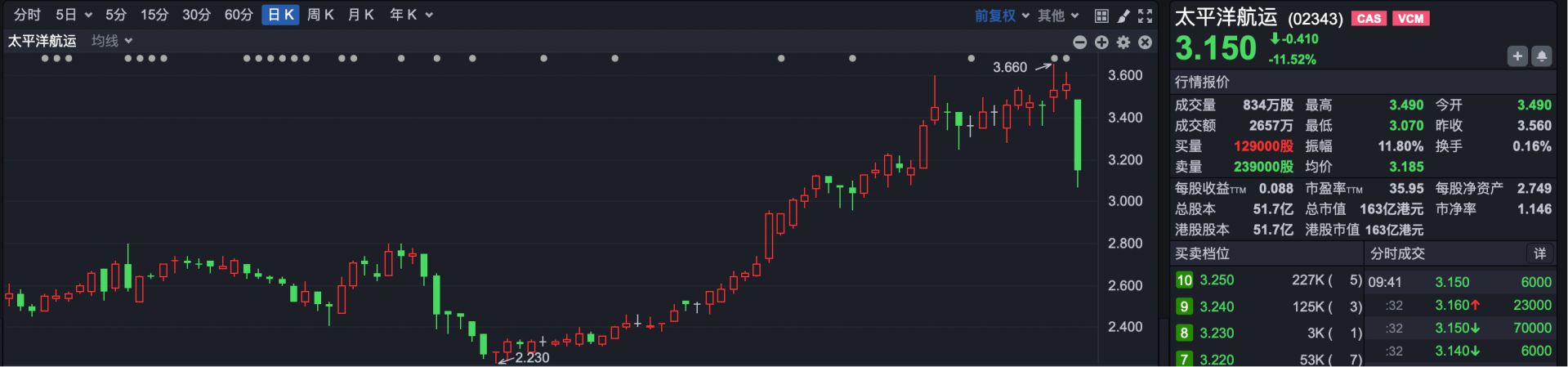港口运输板块集体大跌。截至发稿,太平洋航运、中远海能跌超 10%,中远海发跌超 8%,中远海控跌超 5%。