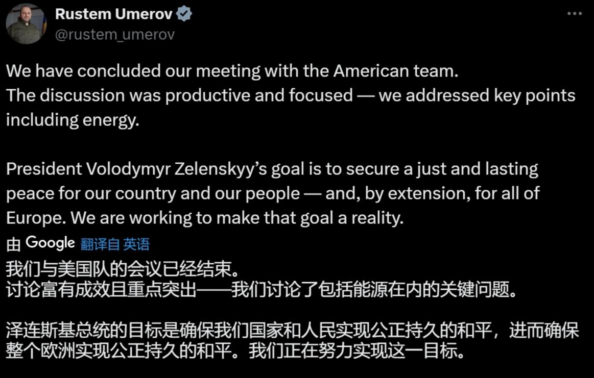 会谈结束后,此次率领乌方代表团的乌克兰国防部长鲁斯特姆· 乌梅罗夫 (Rustem Umerov) 在社交媒体 X 上发文称与美方的讨论“ 富有成效且重点突出”,并表示双方讨论了包括能源在内的关键问题,他还称“ 泽连斯基总统的目标是确保我们国家和人民实现公正持久的和平,进而确保整个欧洲实现公正持久的和平。我们正在努力实现这一目标。”